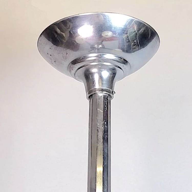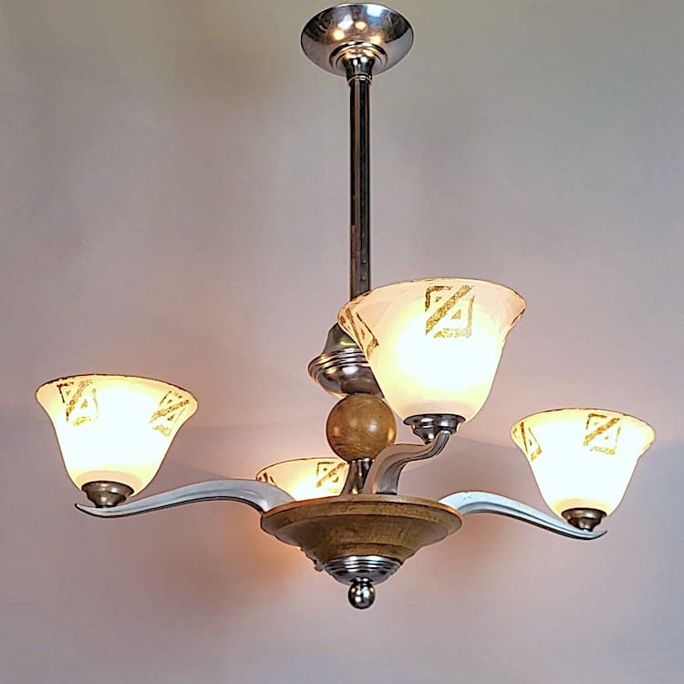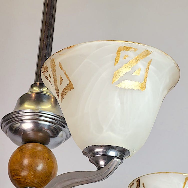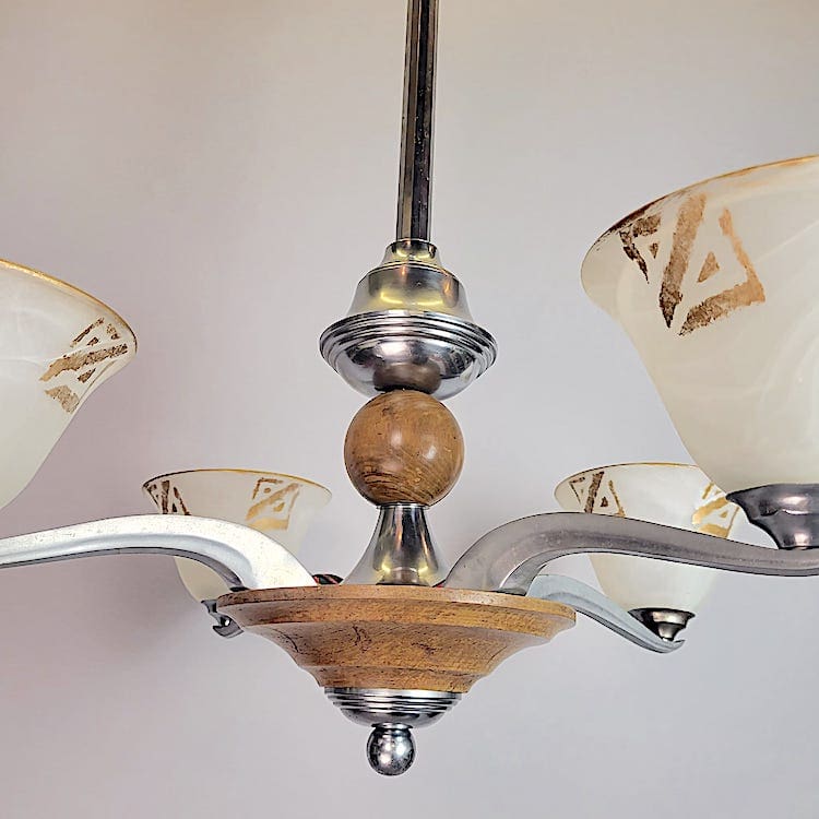 Wood and chrome 4 branch ceiling lamp with hand painted opaque glass which have a geometric gold pattern.