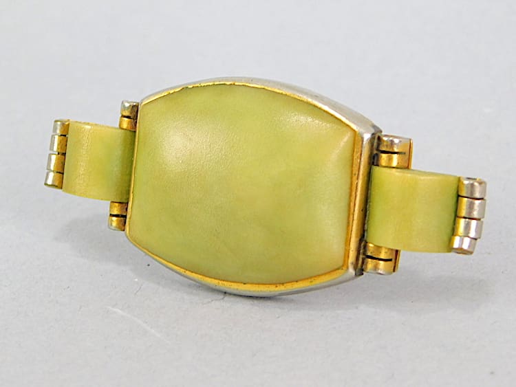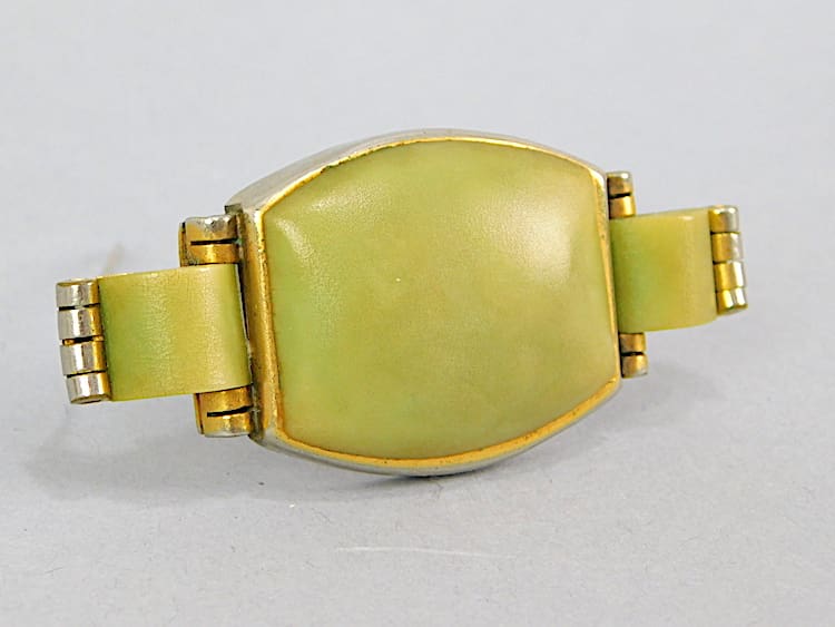 Green celluloid brooch made by Jakob Bengel for Fabon of Paris, marked Depose to the reverse.