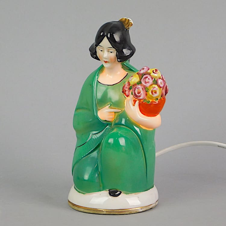 Hand painted French ceramic lady holding a pot of flowers for putting the perfume in. Still retains its original old wire and bulb holder.