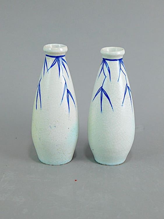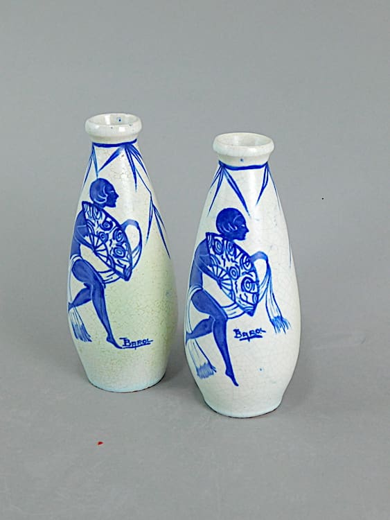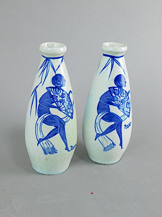 A very beautiful and stylish pair of small vases, beautifully hand painted with a nude holding a fan. They are signed.