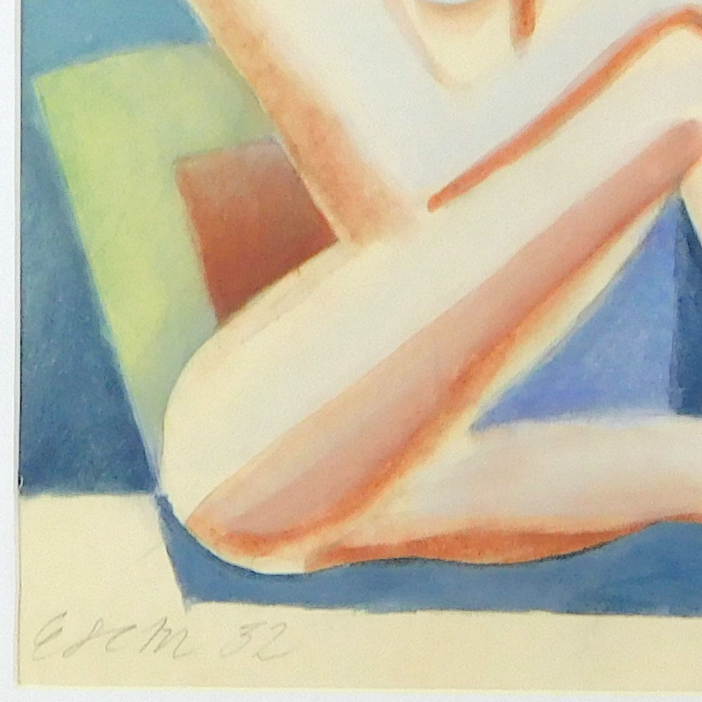 French art deco early 1930s cubist nude lady, a water colour painting by EHM. Painted on paper and signed EHM to one corner and dated 32.