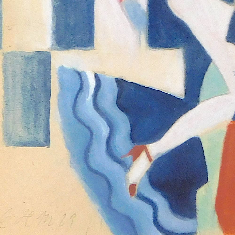 French art deco early 1930s cubist lady in a stylish zig zag dress, a water colour painting by EHM. Painted on paper and signed EHM to one corner and dated 29.