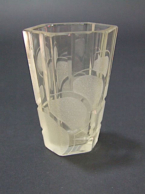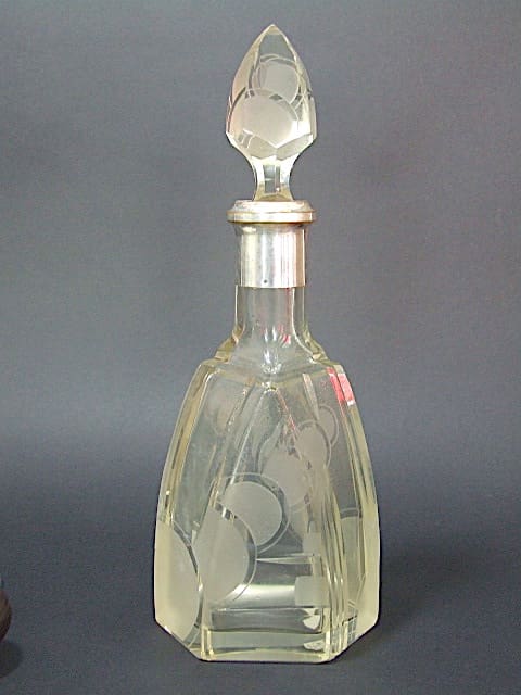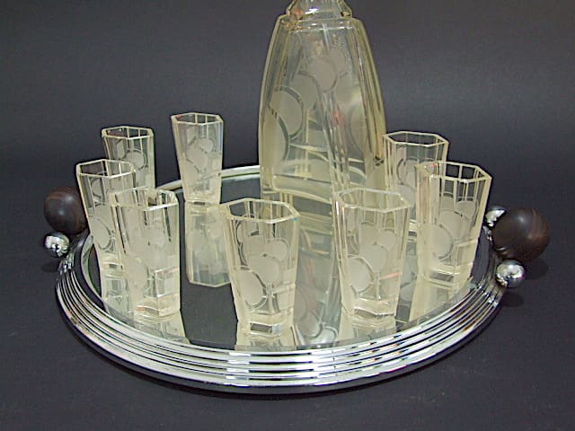 French glass decanter set. Multi faceted and etched an frosted art deco cloud motif to the decanter and shot glasses. A full compliment of 8 hexagonal shaped glasses. The decanter itself appears to be hallmarked to the silvered metal rim but it may be just the makers mark. The tray has a mirrored bottom although not guaranteed to be the original, is of the period and has a stepped silver metal outer ring and two macassar ebony ball handles flanked with a pair of smaller silvered metal balls.