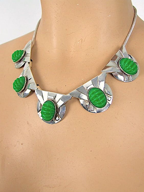 Silvered metal and green glass Egyptian themed necklace, strung on a silvered snake chain. The metal sections with deco motif. The glass sections raised and with scarab ribbed detail.