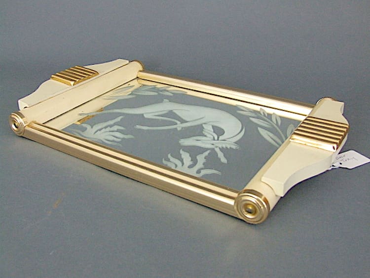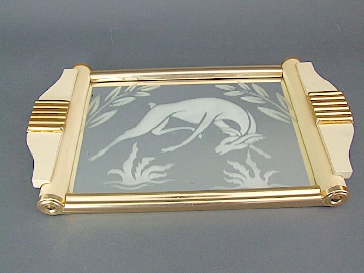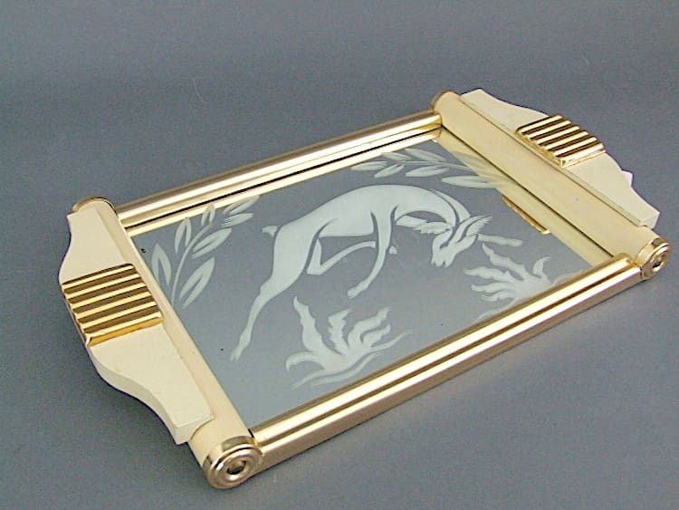 French art deco modernist tray with mirror base and frosted stylised deer and foliage detail.