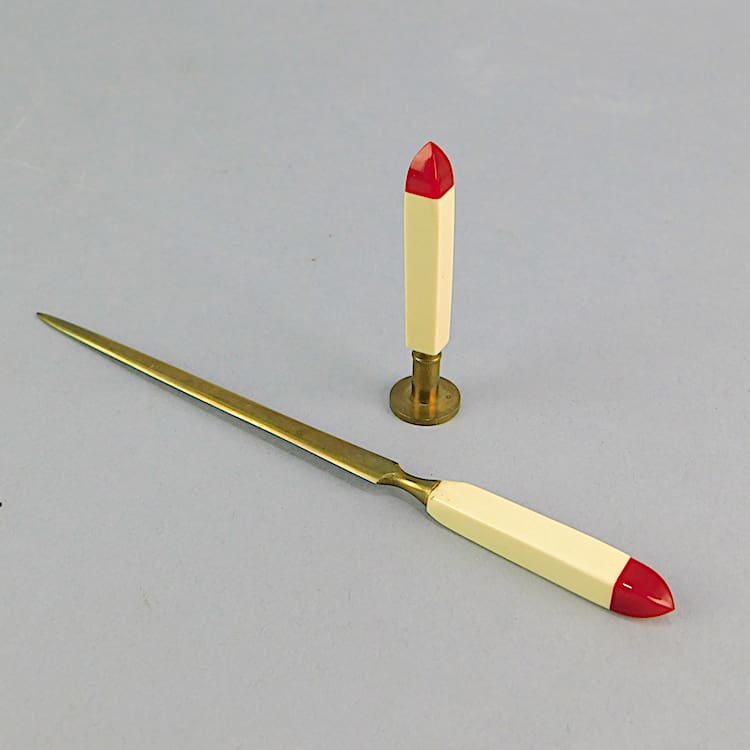 French phenolic handles desk set in its original gift box. Consists of a seal and a letter opener knife.