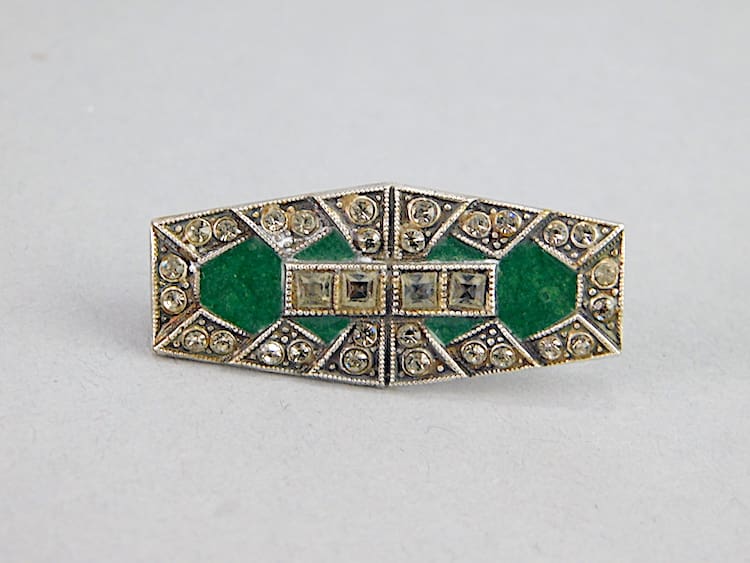 Green enamel and diamonte bar brooch. Fitted with a roll safety clasp.