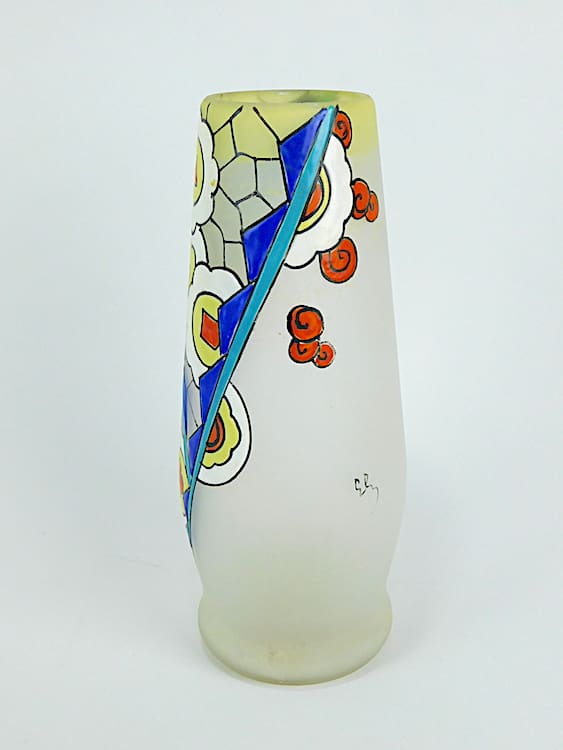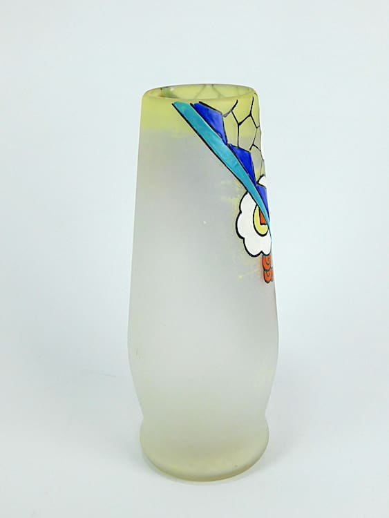 Very rare stylish geometric floral vase made of frosted glass with wonderful very Deco stylised floral detail hand painting around it and is signed on the side with the initials that I believe are ER. The colours are spectacular in bright yellow, red, white, navy and turquoise.