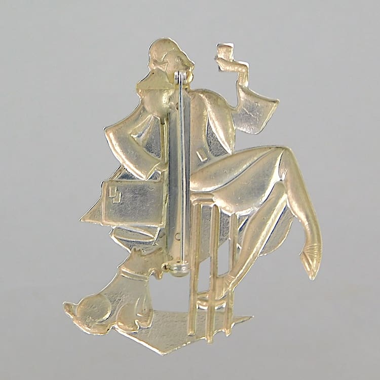 Art deco flapper lady at a bar with her dog. Fitted with a roll safety clasp.