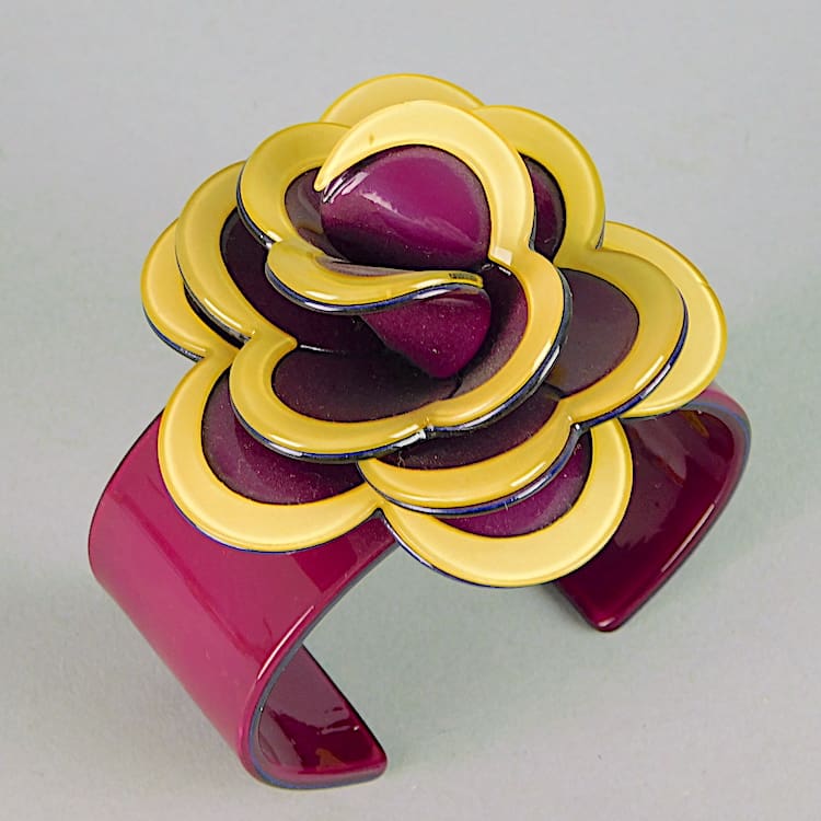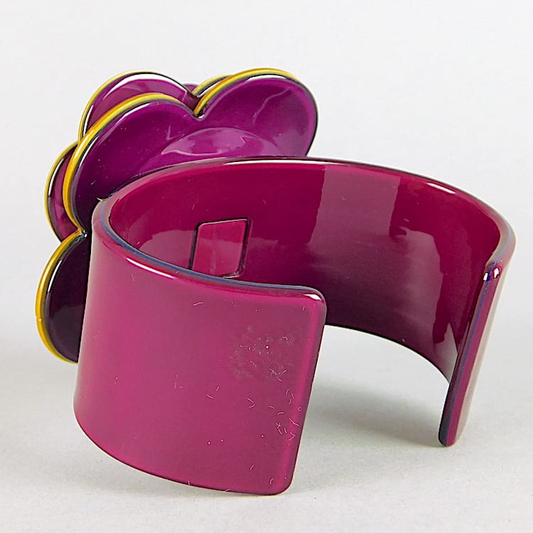 French chunky celluloid flower bangle in purple and yellow.
