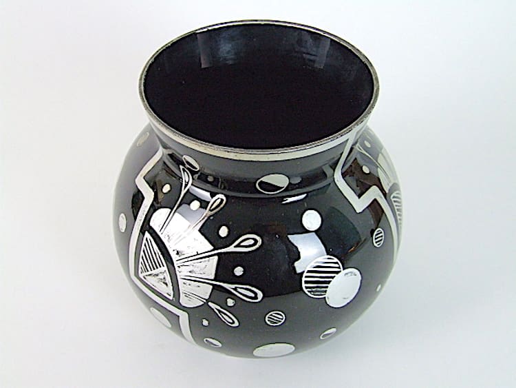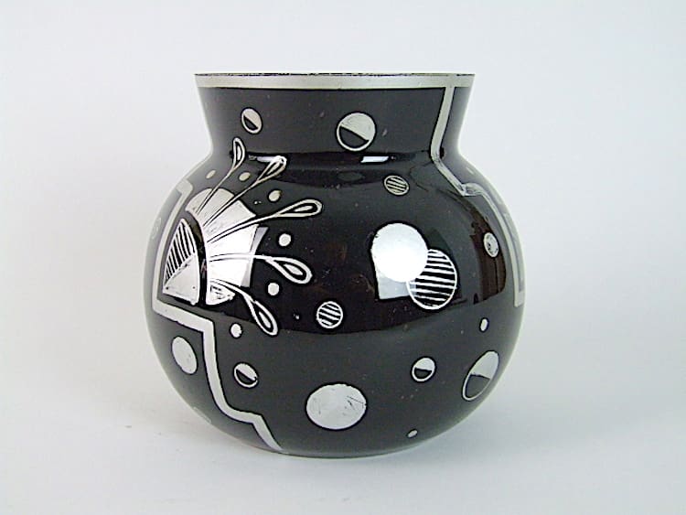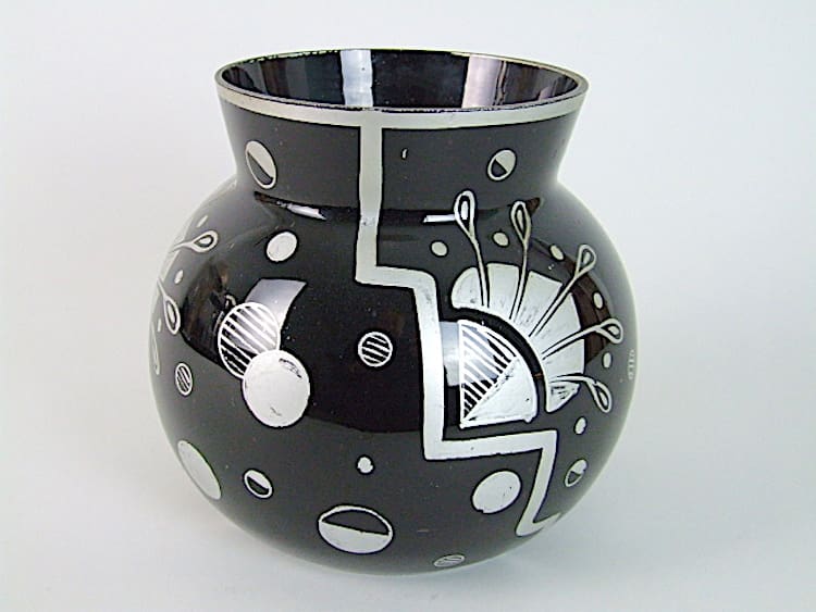 French art deco black glass with silver hand painted detail. Unsigned but possibly by Hem.