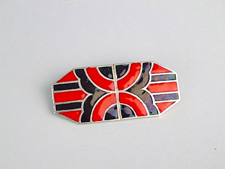French heavy red and black enamelled geometric brooch. Fitted with a roll safety clasp.