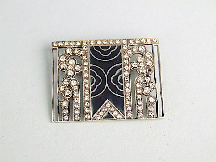 French heavy black enamel and diamonte brooch. Fitted with a roll safety clasp.