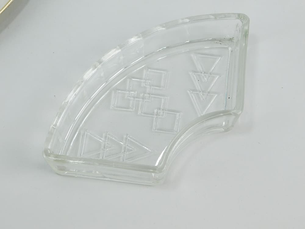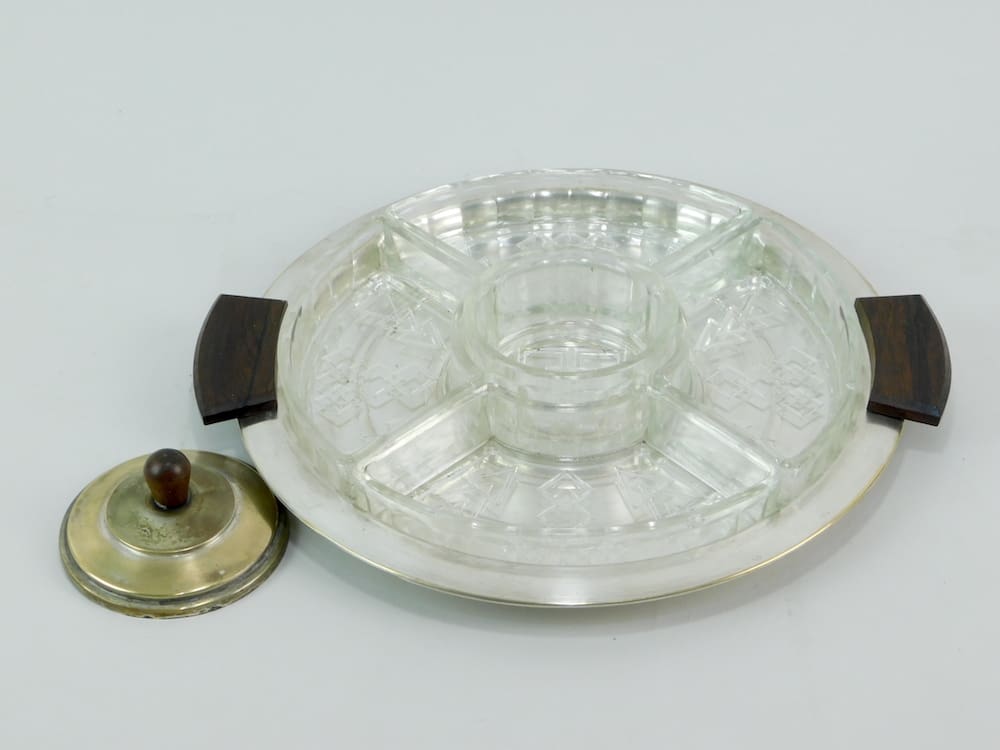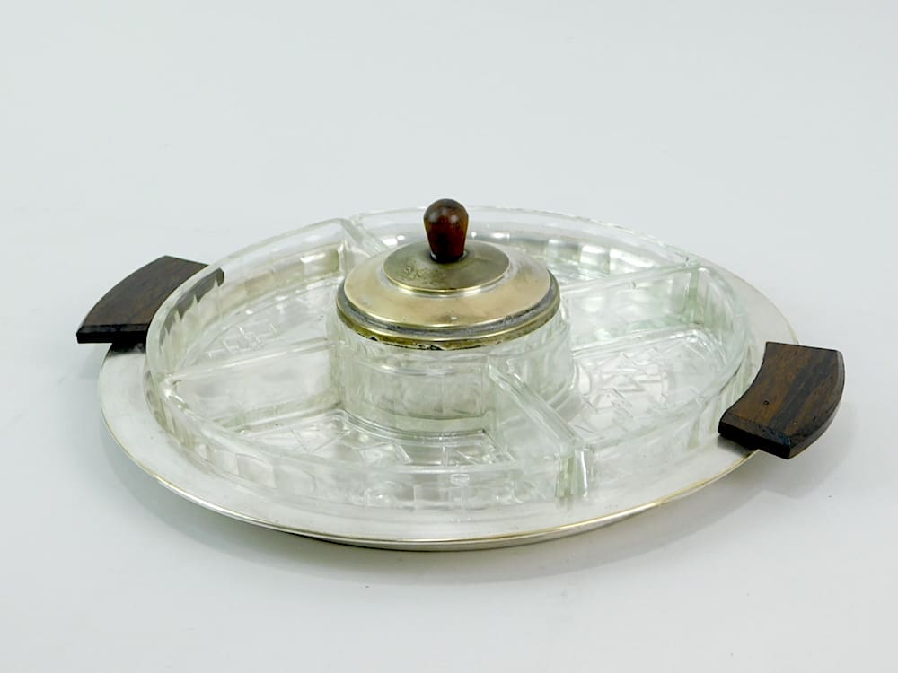 French art deco hors d’oeuvre dish with 5 glass inserts all with deco patterning, central one with metal lid with macassar handle which matchers the handles to the tray.