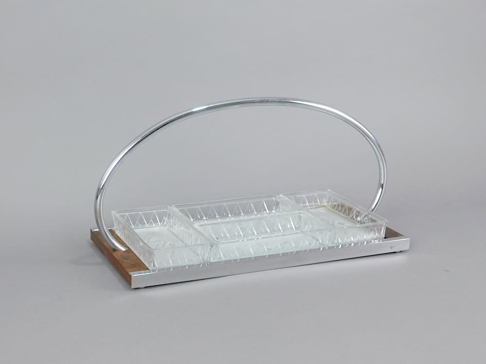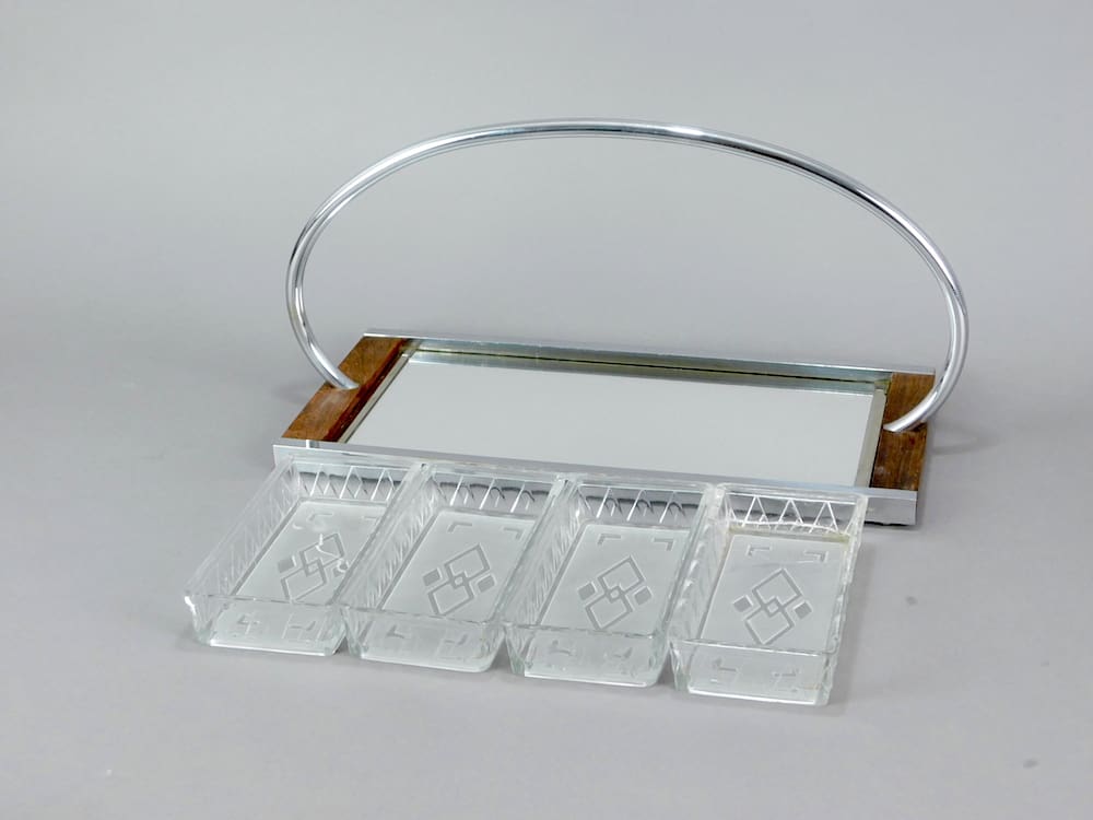 chrome handled tray with walnut sides and four removable glass dishes on a mirror bottom.