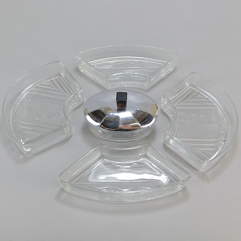 Five separate glass dish sections – one with a lid and macassar finial.