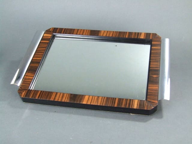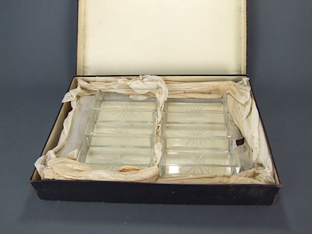 French aperitif set in its original box. Top quality set with mirror bottom tray that has macassar sides and six glass insert dishes. The set comes in its original box.