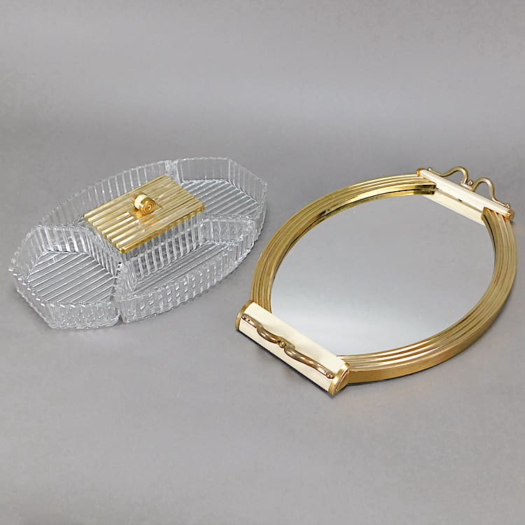 A beautiful, stylish French gilt metal Hors d’oeuvres tray with ribbed edges, mirrored bottom and scroll handles.