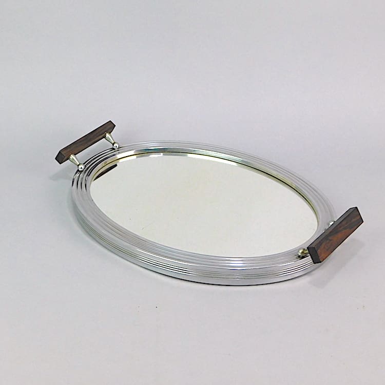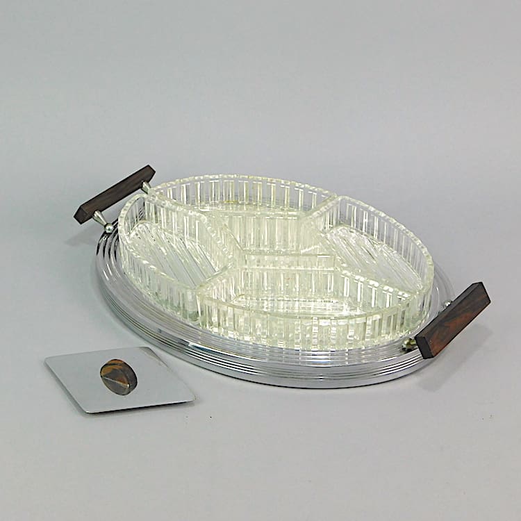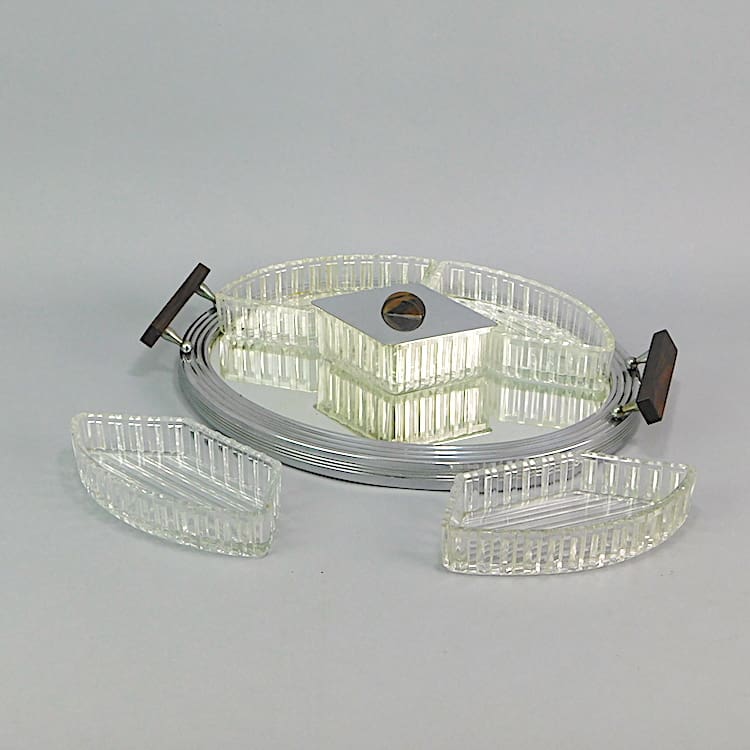 Stylish glass tray with macassar ebony handles and 5 removable dish sections, the central one with a lid.