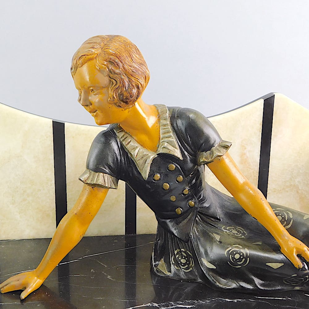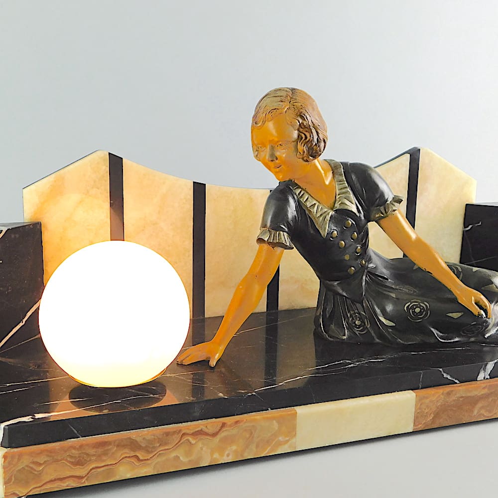 Large and heavy marble and onyx walled spelter lady lamp. Unsigned, artist unknown. She has a mustard skin patina with dinanderie dress and a bobbed hairstyle.