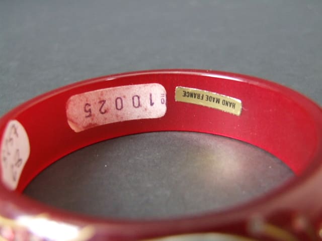 French lucite bangle, hand made in France in the 1930’s. Translucent red with silver glitter panels and diamonte detail.