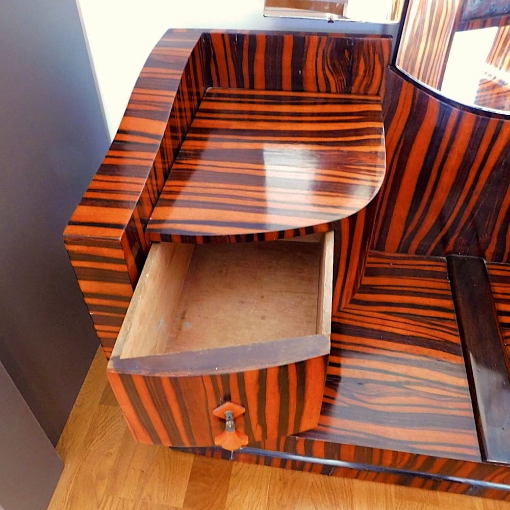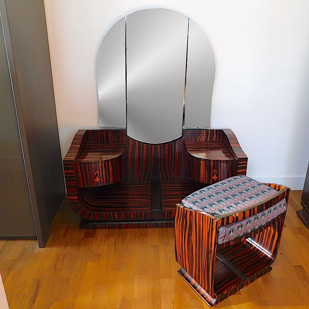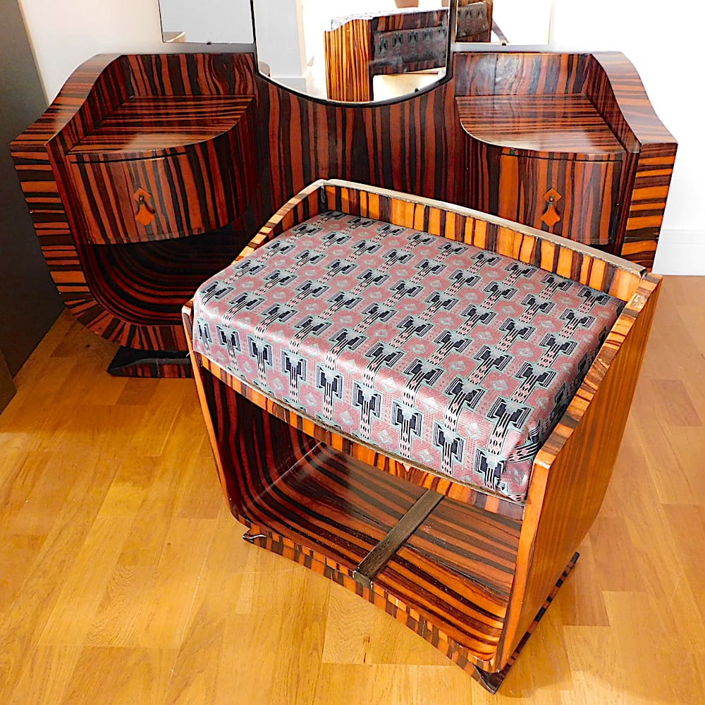 French art deco Macassar ebony zebra stripe dressing table with matching stool.