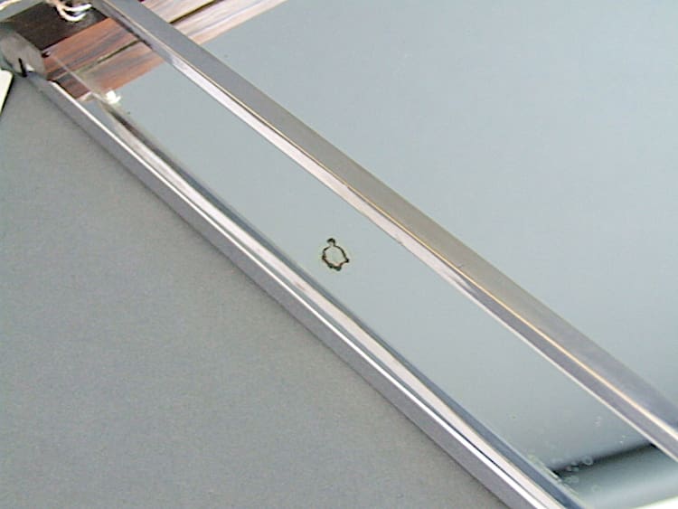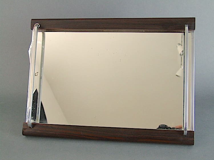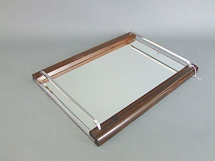 Nice quality French tray with mirror glass base, chrome handles bars and macassar wood sides.