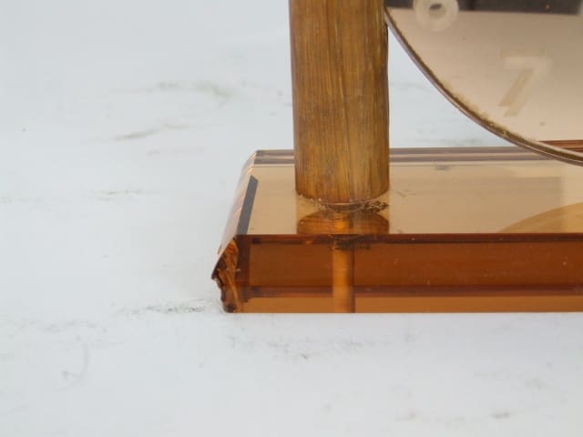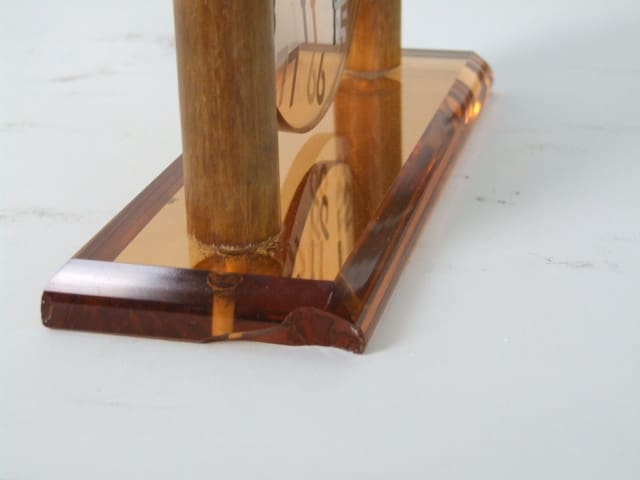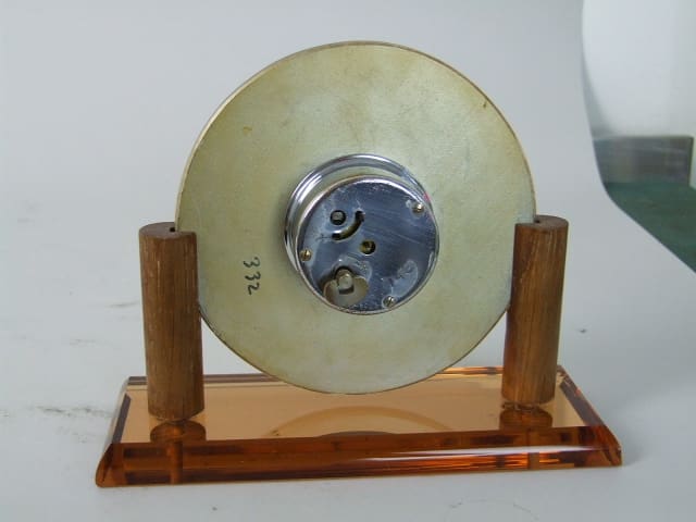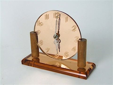 French art deco mantle clock with peach mirror glass face and base panel. Small chip to the base on the side at the left hand corner.