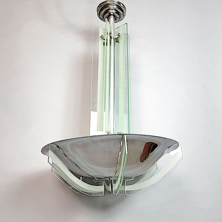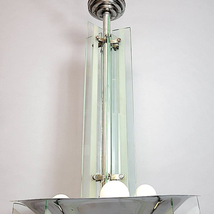 Large glass and chrome modernist ceiling lamp with glass panels to the stem and wing detail to the chrome shade.