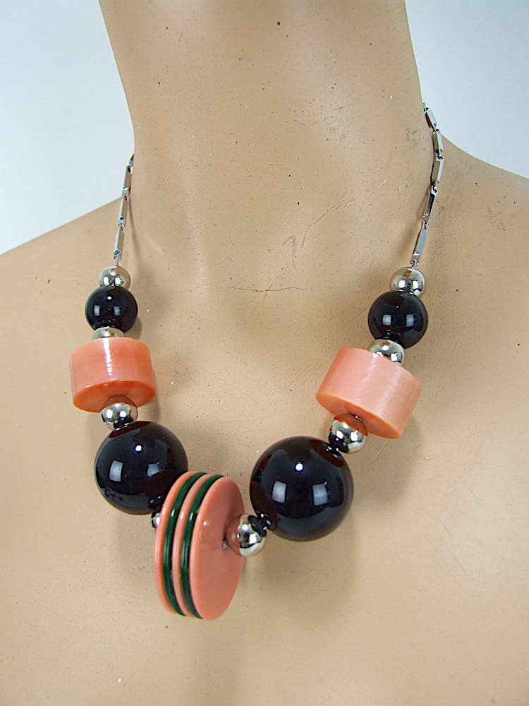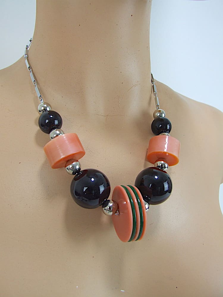 Black and Coral French vintage galalith Art Deco necklace.