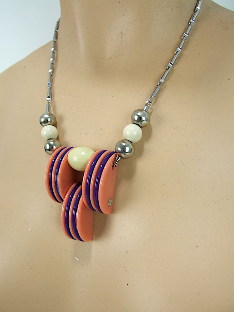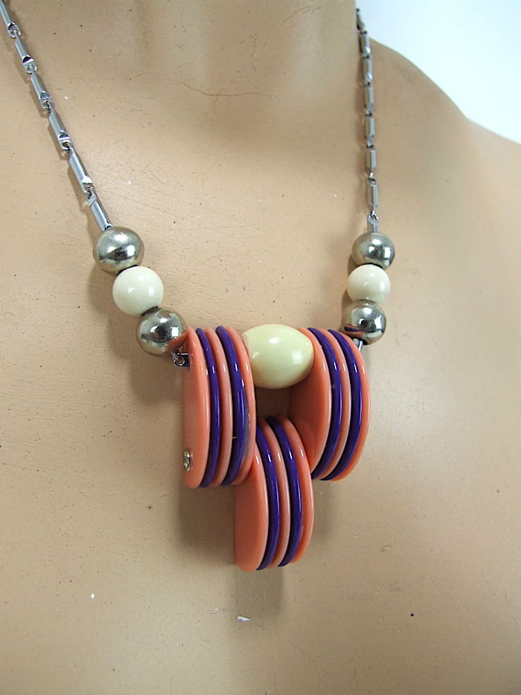 French modernist coral and purple vintage galalith art deco necklace.
