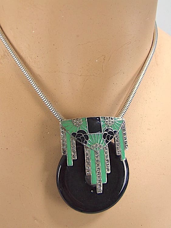Fabulous chromed metal snake chain necklace with black onyx doughnut and green enamel and diamonte panel.