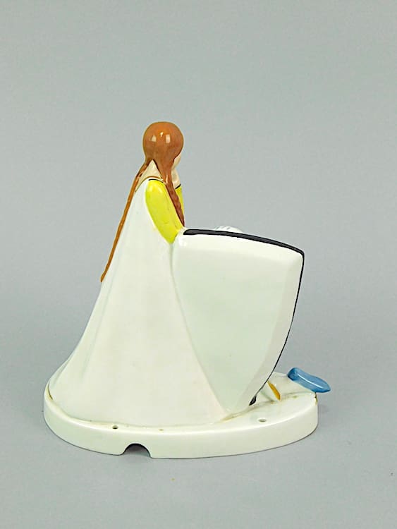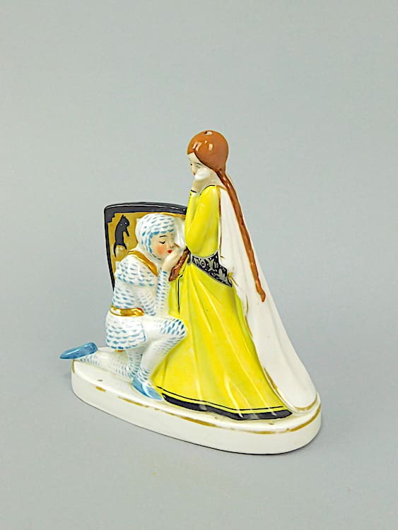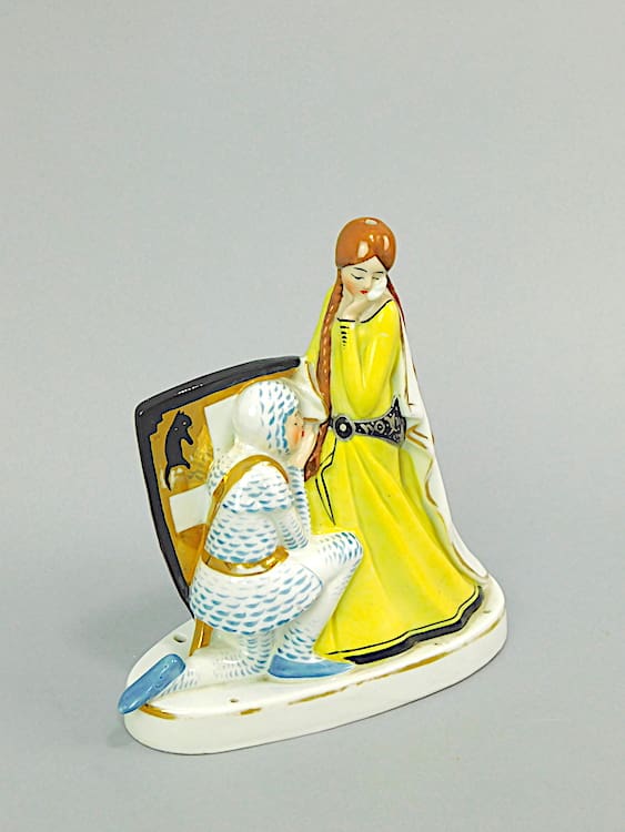 A knight and maiden – French china night lamp bearing holes in the base and head for heat escape. It has an impressed number. Unwired. Possibly originally a perfume lamp as there is a hole in her head where the perfume oil may have once been filled.