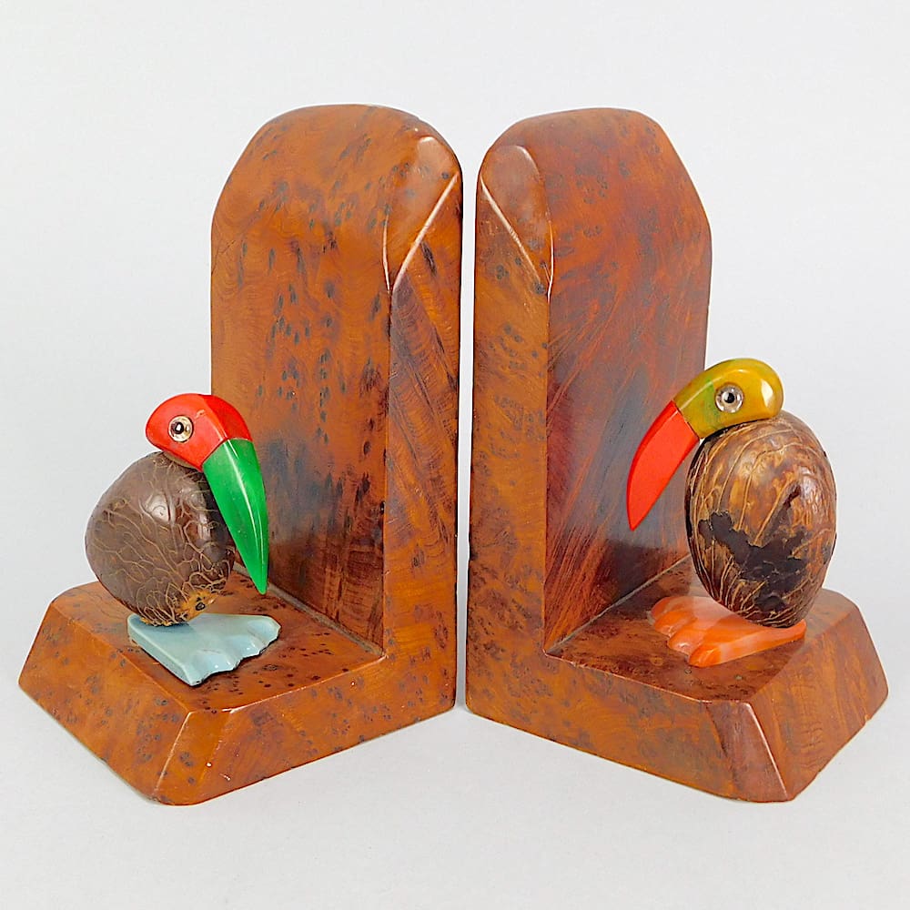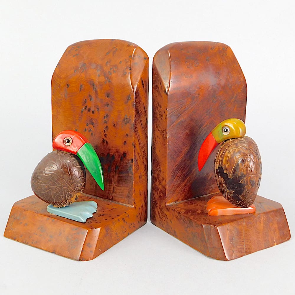 Vivid coloured galalith nutbird bookends mounted on an amboyne wooden base.