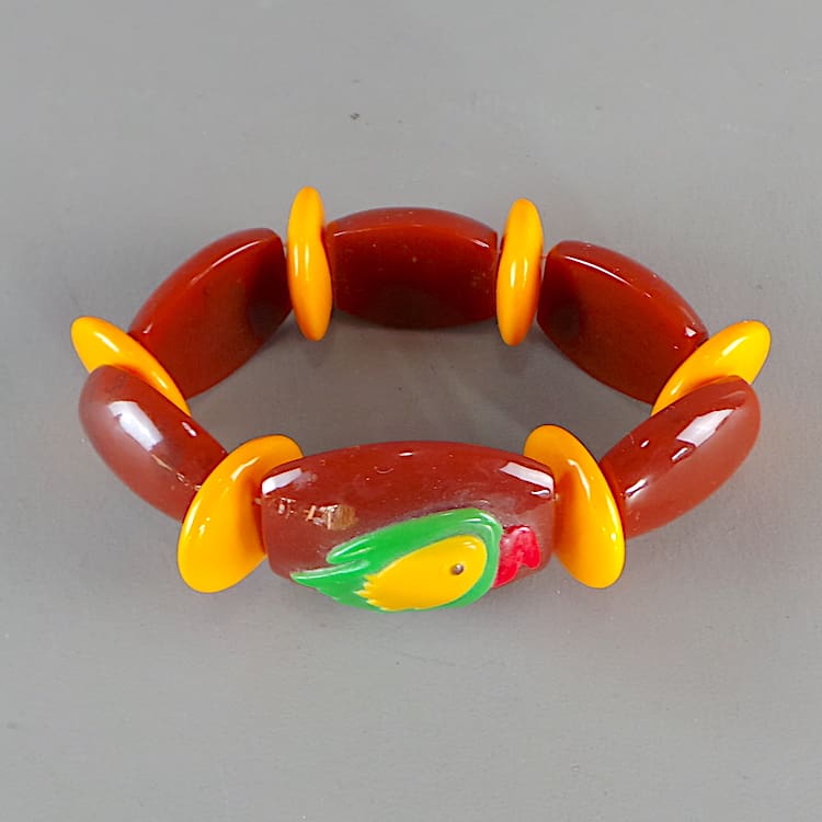 A vintage French art deco phenolic bracelet with a parrot on the central panel.
