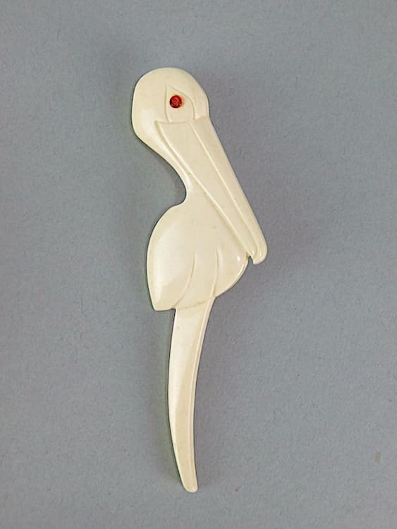 French art deco 1920s phenolic pelican brooch. Fitted with a roll safety clasp.