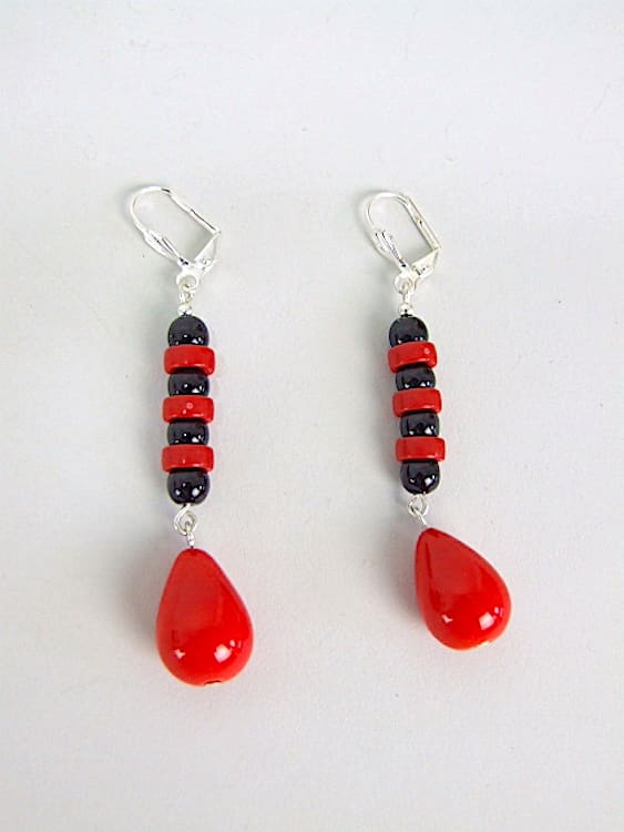 Black and red phenolic and onyx with silver clasps art deco earrings. Made for pierced ears with hoop fitting.