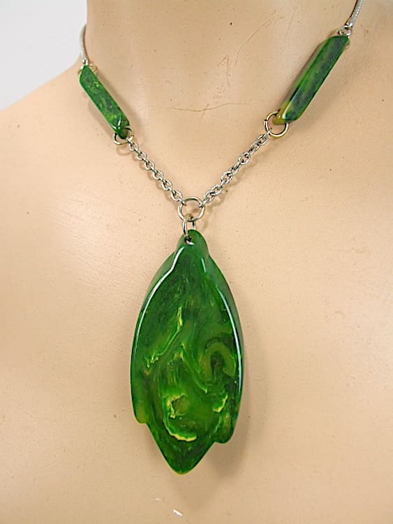 French art deco necklace with green and yellow marbled phenolic pendant.