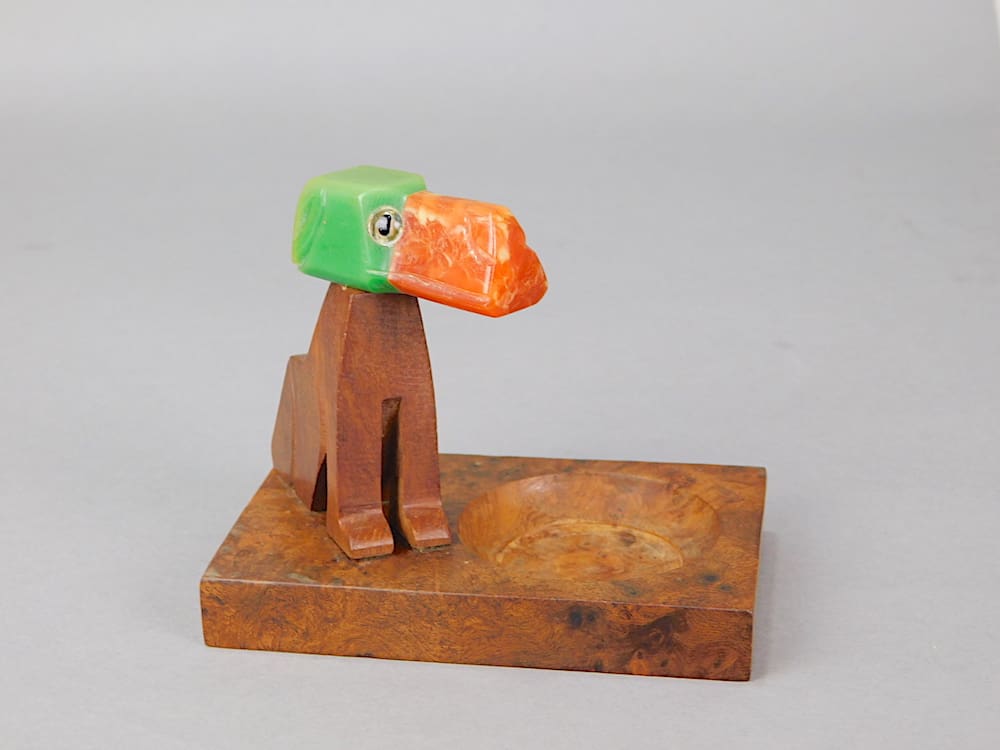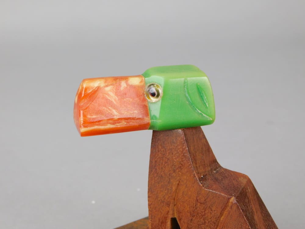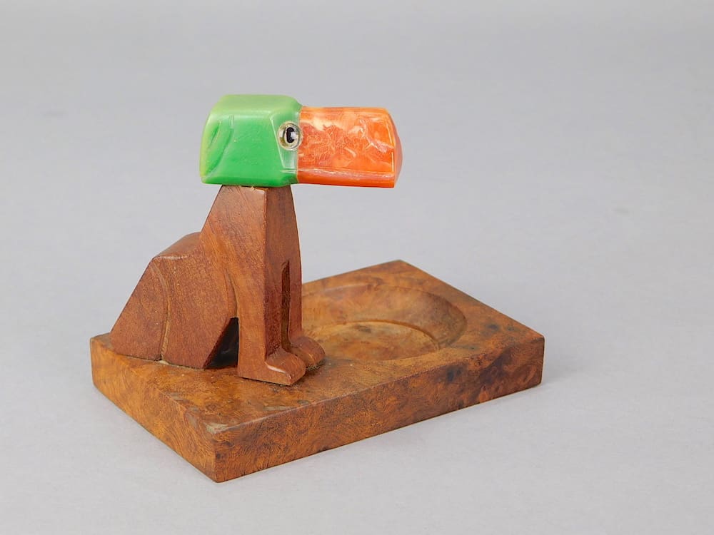 French art deco amboyne cubist dog with a phenolic head in orange and green He has glass eyes. Probably a pin dish or trinket dish.