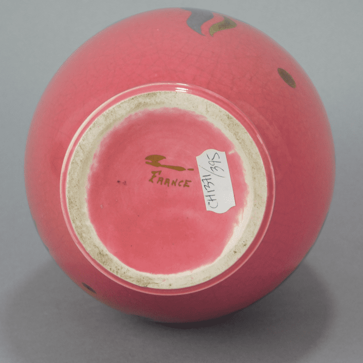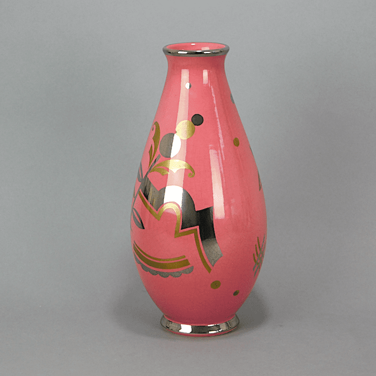 Pink glazed tapered art deco vase decorated with geometric leaf design in silver and gold lustre.