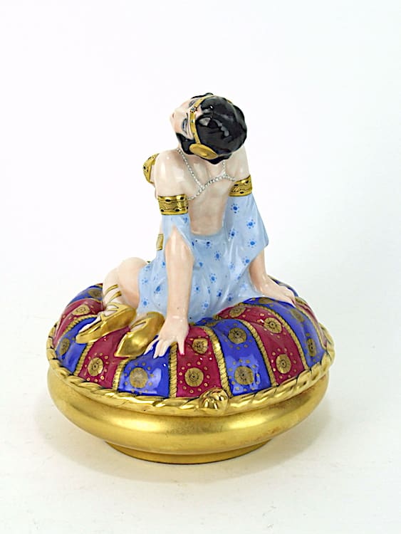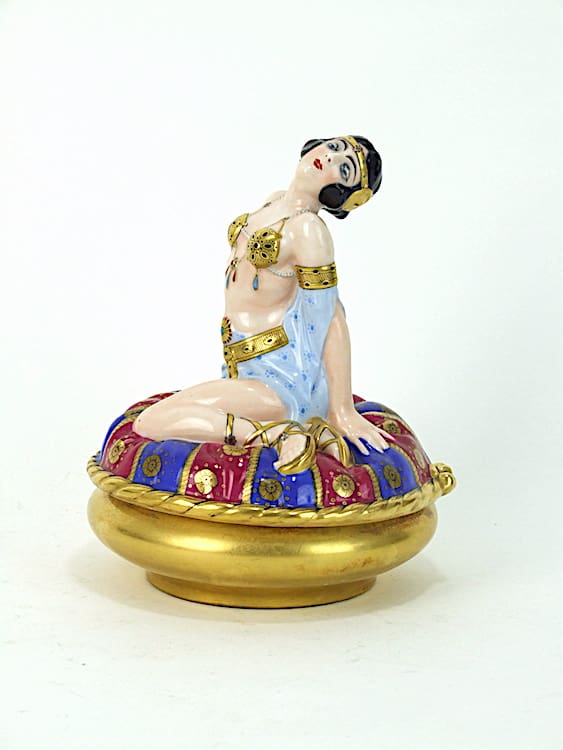 Hand painted French ceramic gilt powder bowl and lid featuring an Egyptian style lady. Apparently unsigned, although I suspect by Aladin. Very nice detail to the painting and the lady’s dress.