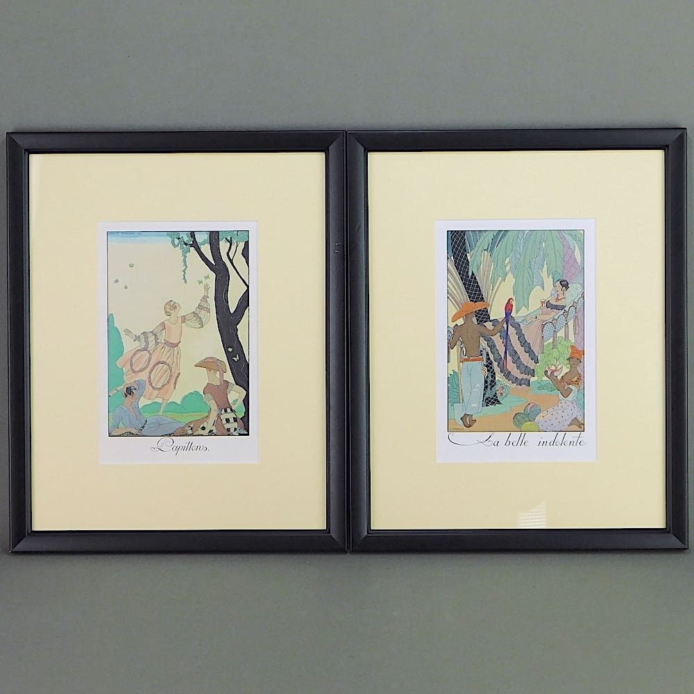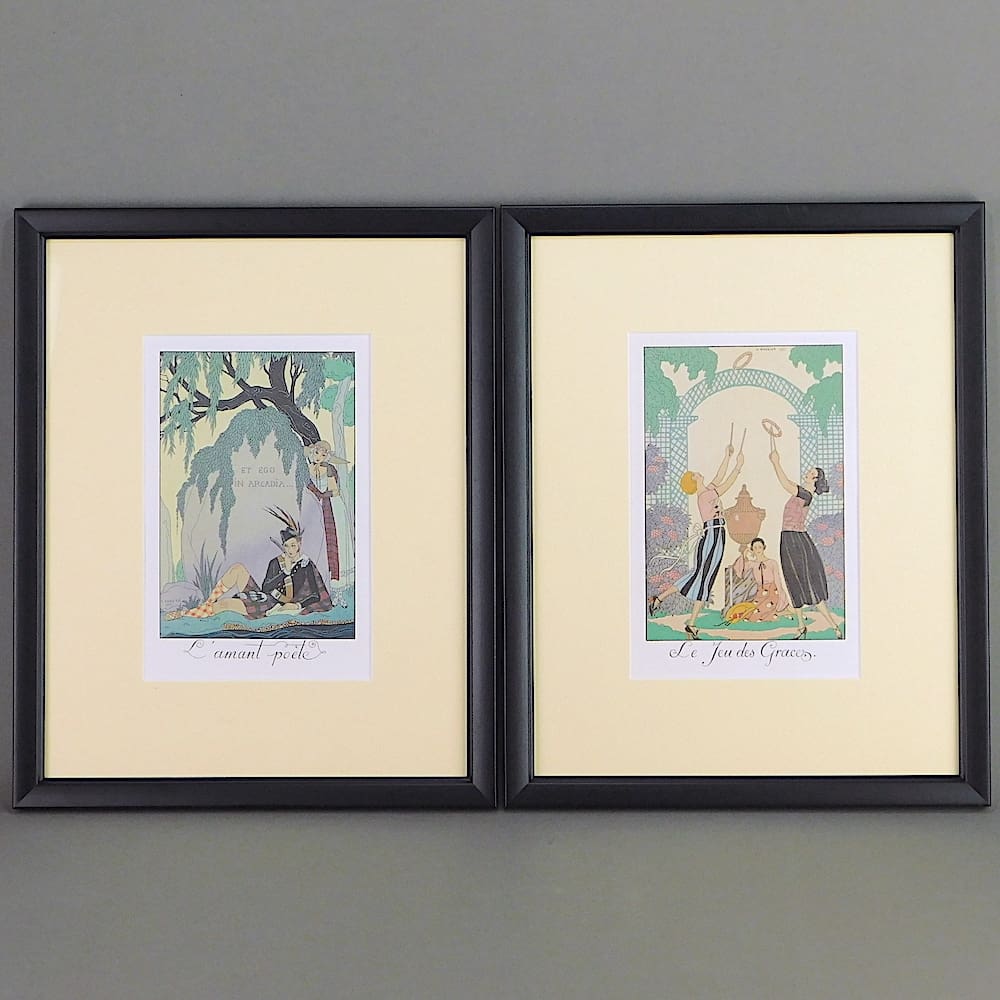 Set of 4 art deco prints by Georges Barbiere professionally mounted in high gloss black wooden frames.