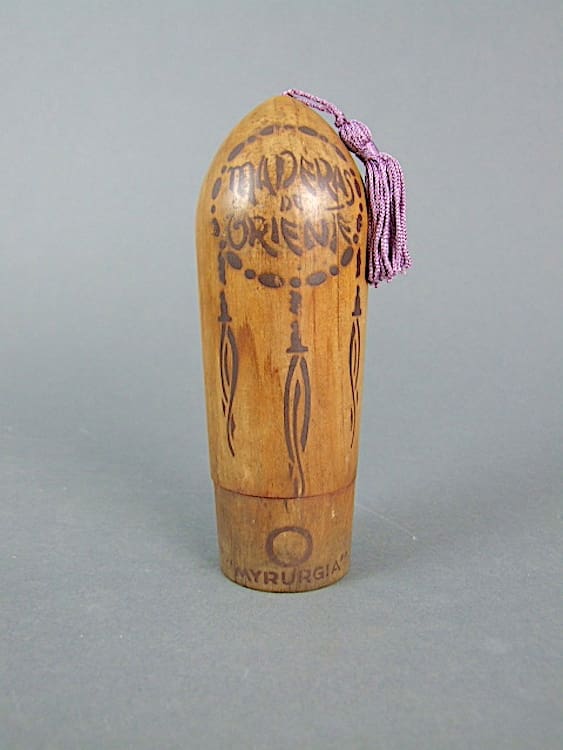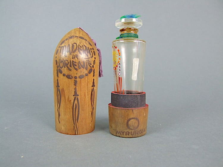 Maderas Oriente, French scent bottle in its original wood case with tassel.