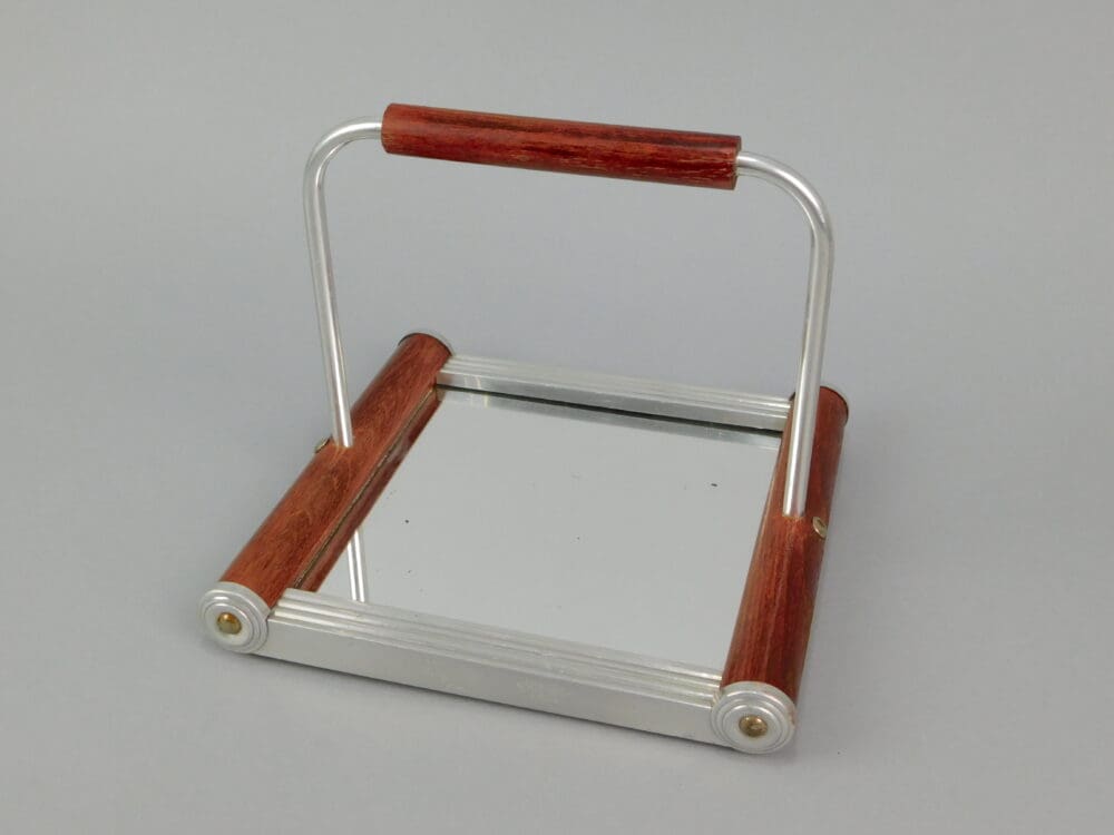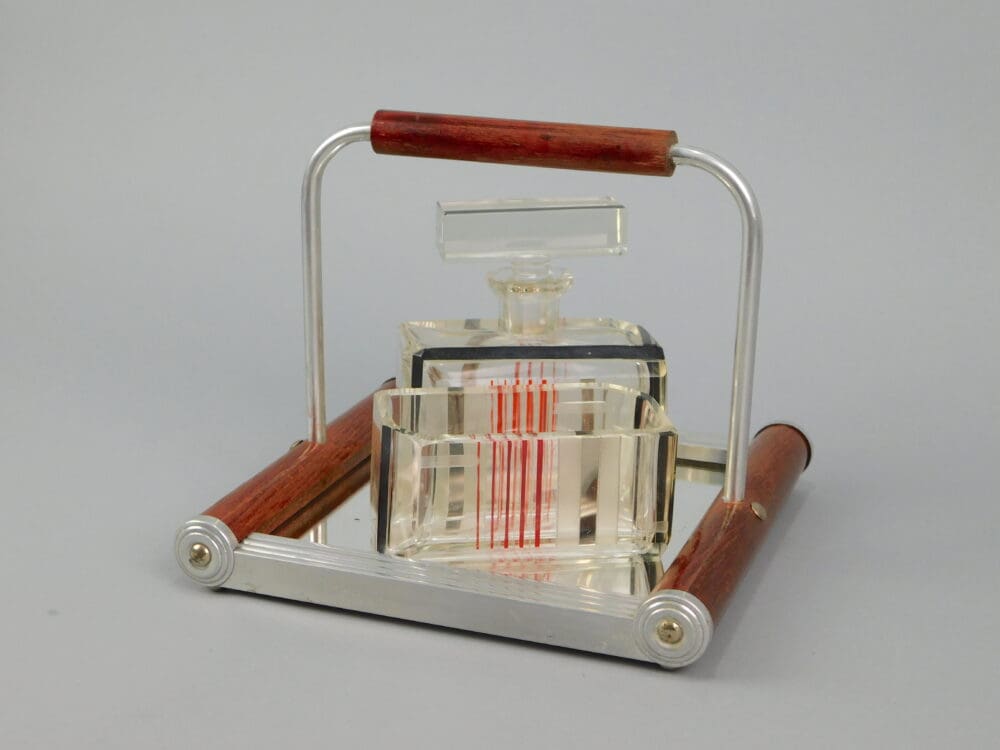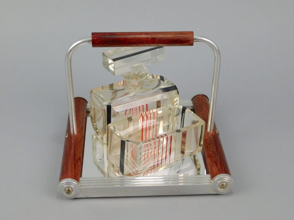 French glass three piece dressing table scent set. Consists of scent bottle, trinket dish and mirrored tray.