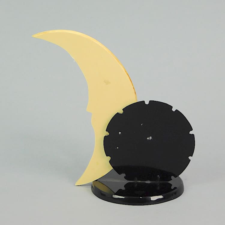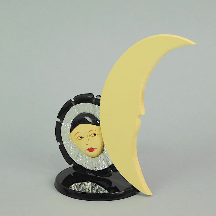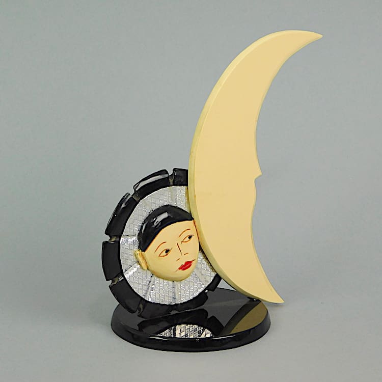 Phenolic hand painted 1920s shop display item. Hand painted pierrot and moon.