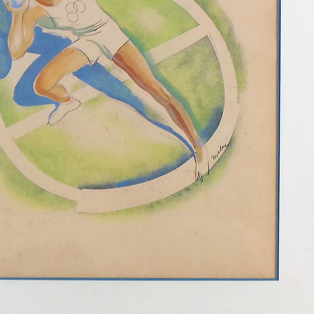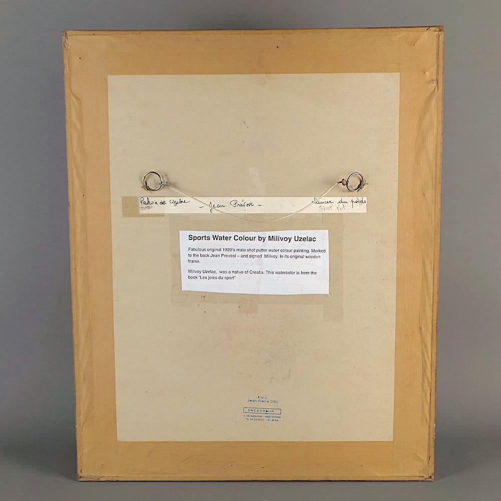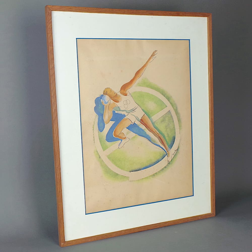 Fabulous original 1920’s male shot putter water colour painting. Marked to the back Jean Prevost – and signed Milivoy. In its original wooden frame.