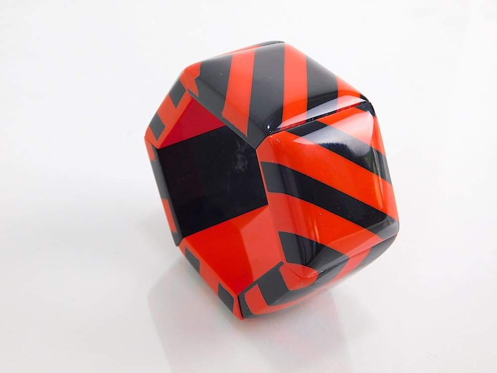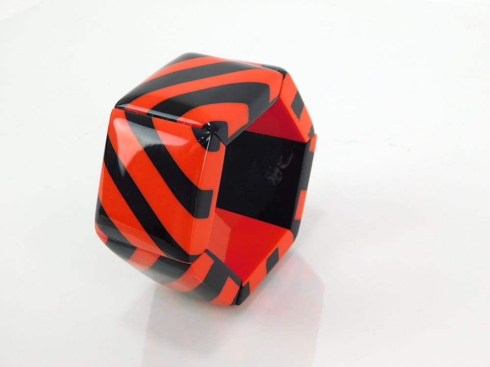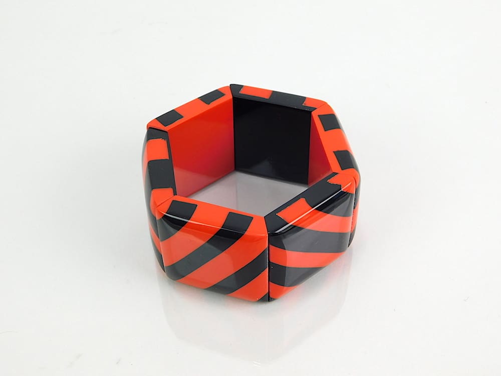 An art deco stretch bangle with red and black phenolic panels.