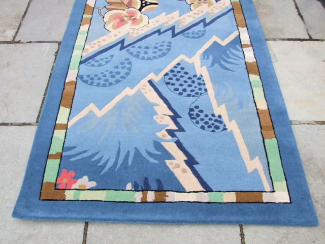 All wool (100% sheep’s wool) hand made tufted rug with French art deco stylised floral detailing in blue and cream colouring.