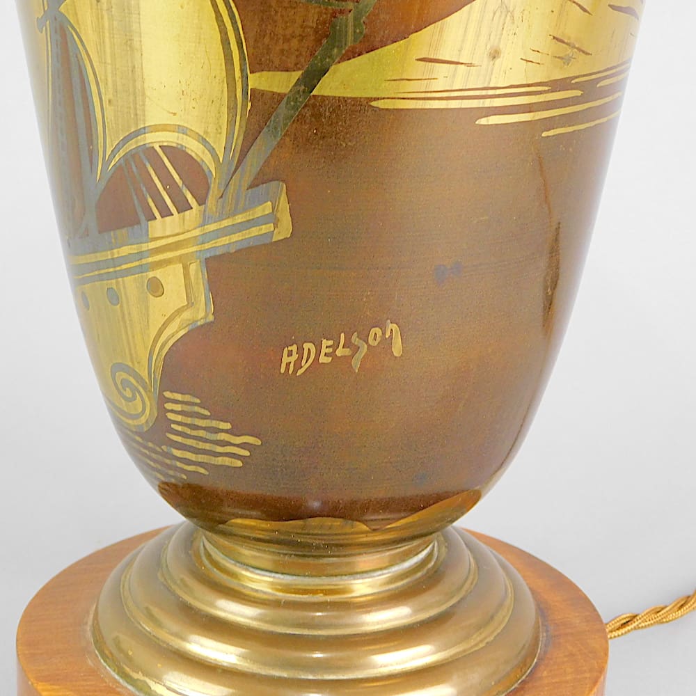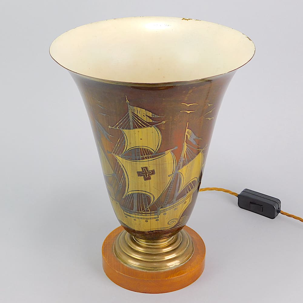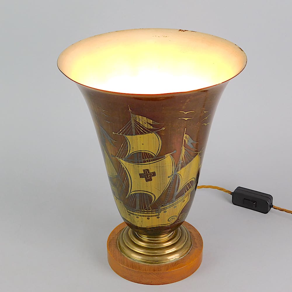French trumpet uplighter enamel dinanderie Galleon detailing, mounted on a wooden base. Signed to the side Adelson. Inside there is a single bulb and fitted with an inline on/off switch.