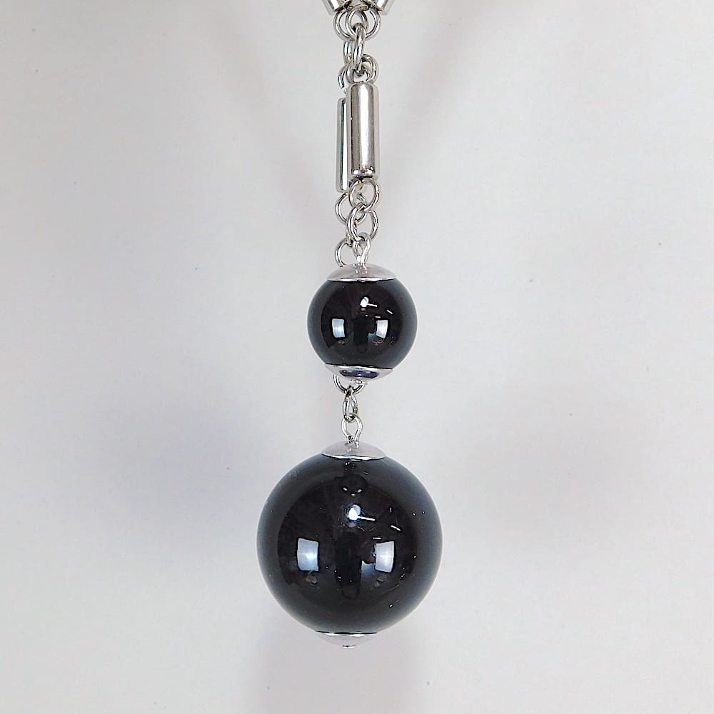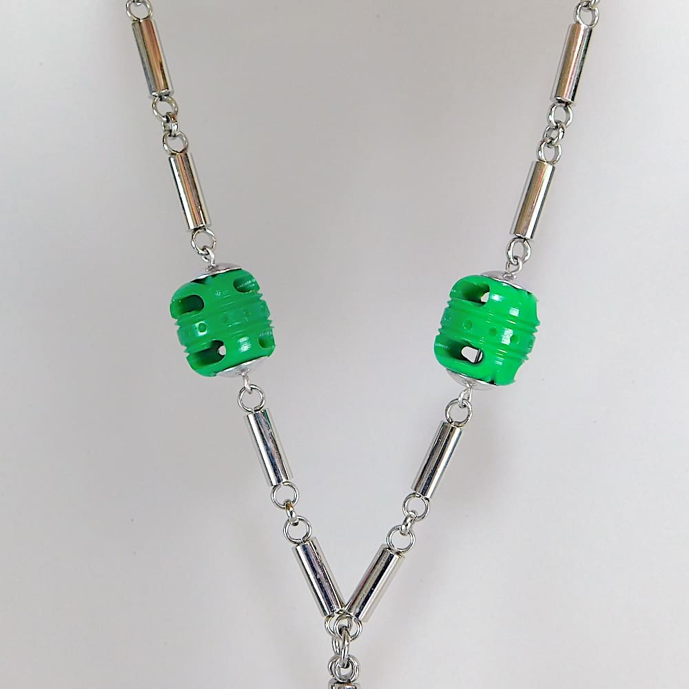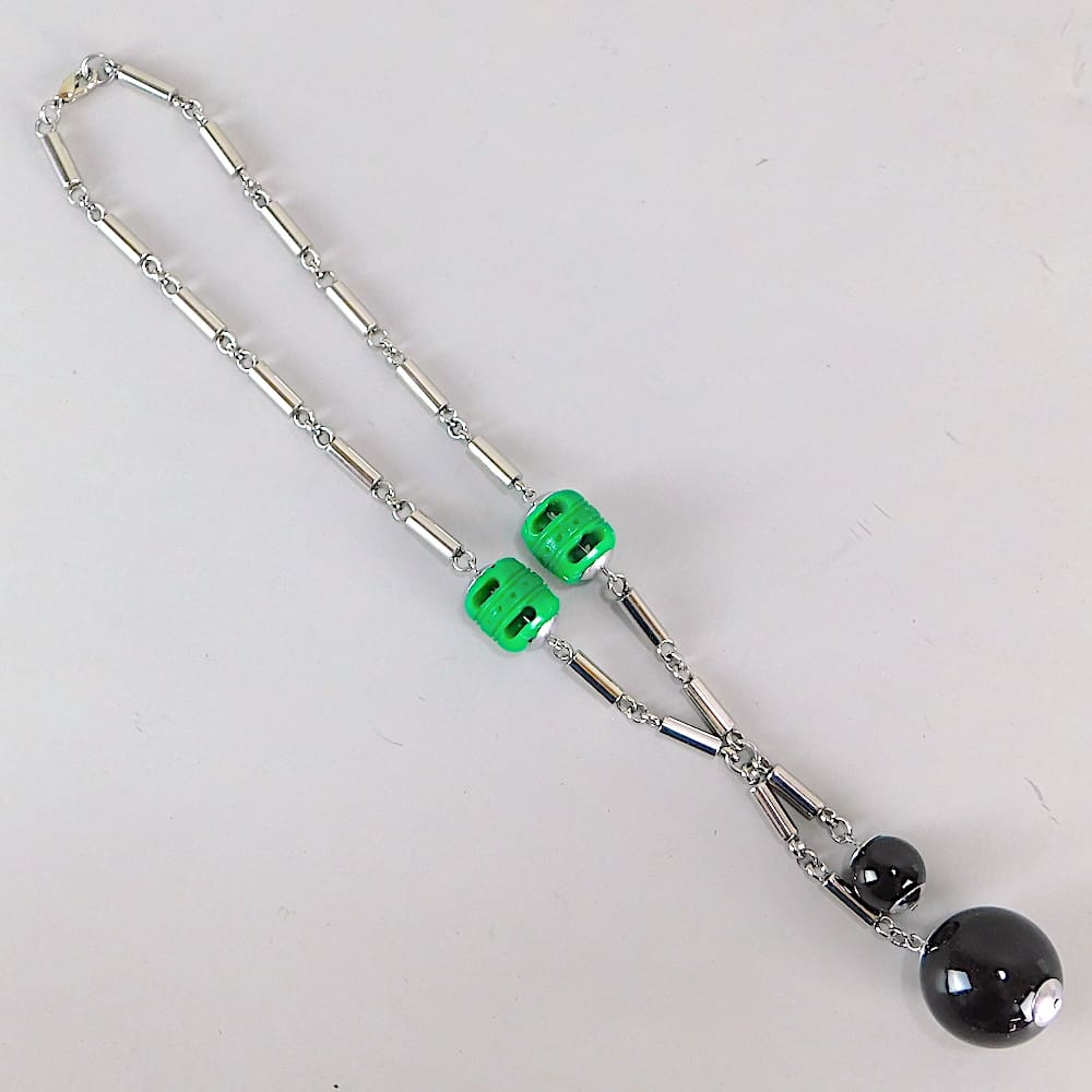 Modernist art deco galalith and chrome tassel necklace in green and black.